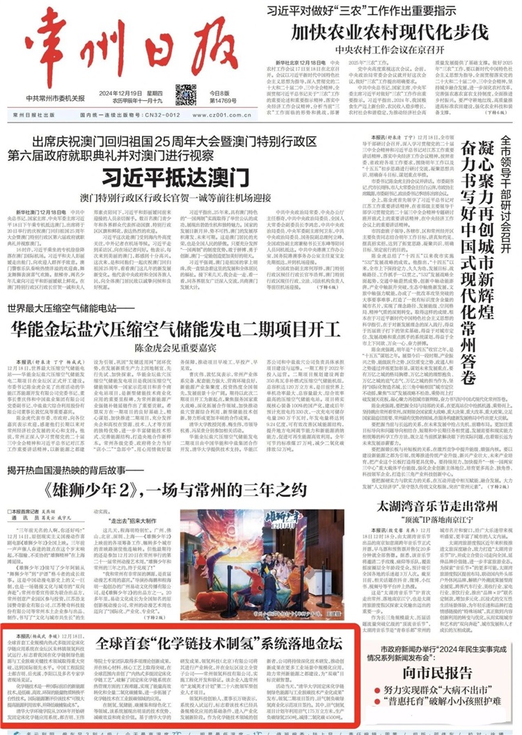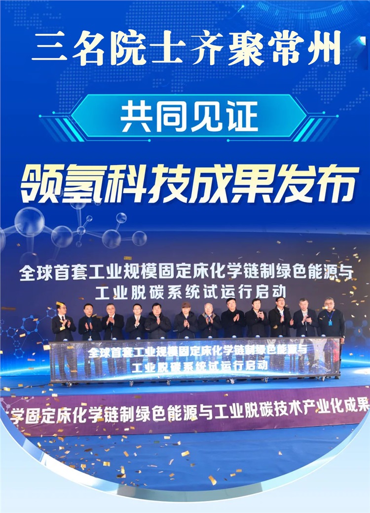 2024年12月18日,全球首套工业规模内热式多级固定床化学链应用系统在常州领氢科技试运行,这标志着我国在化学链制绿色能源与工业脱碳关键技术领域取得重大突破,达到国际领先水平。中国工程院院士郝吉明、岳光溪、李阳以及多名教授专家学者及知名企业家现场见证。《常州日报》更是在头版刊发要闻《全球首套“化学链制氢”系统落地金坛》,报道领氢科技全球首套“工业规模内热式多级固定床化学链应用系统”启动试运行。